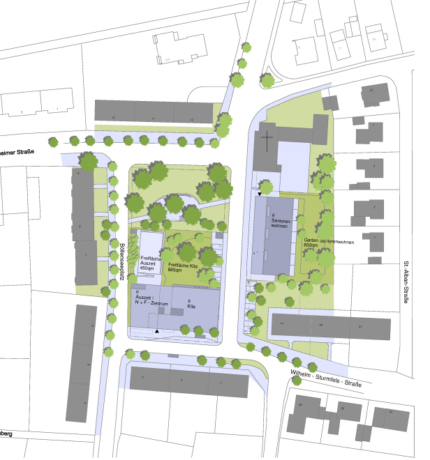 Für die Neubebauung stehen Flächen einer evangelischen Kirchengemeinde und der städtischen Wohnungsbaugesellschaft sowie ein Teil der städtischen Platzfläche zur Verfügung.
