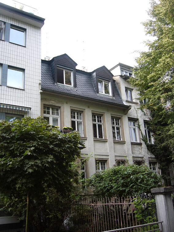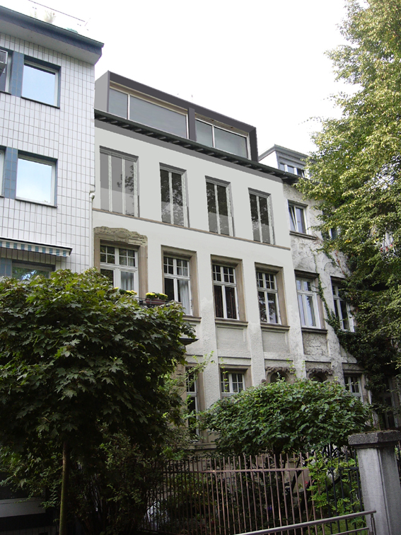 In dem denkmalgeschützten Gebäude, Teil einer Gesamtanlage, soll im Dach zusätzlicher Wohnraum geschaffen werden. In der Höhe wird das Gebäude an das bereits aufgestockte Nachbargebäude angepasst. Die Dachkonstruktion wird neu errichtet. Das Mansarddach wird abgebrochen und die Fassade nach oben erweitert. Die neuen Fensteröffnungen führen die Ordnung des historischen Bestands in reduzierter Formensprache fort.