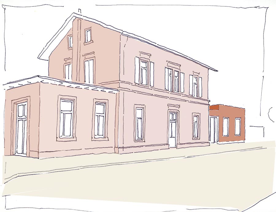 Im Vorentwurf waren die Nutzung des Erdgeschosses als Gaststätte und der Umbau der Obergeschosse zu Pensionszimmern zu prüfen. Grundgedanke des Entwurfes ist die Zurückführung auf die ursprüngliche Gebäudeform mit einseitigem Anbau. Ein vorhandener zweiter Anbau wird baulich so umgeformt, dass sich trotz zeitgemäßer Formensprache ein annähernd symmetrisches Gesamtgebäude entwickelt.
