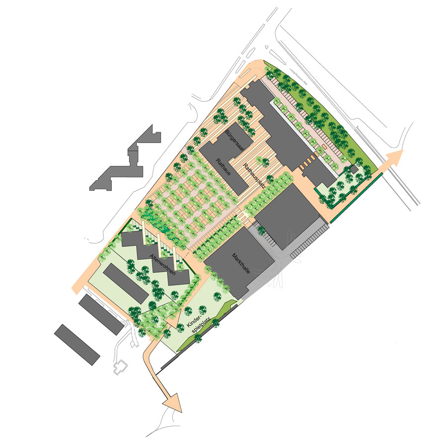Die Stadt Raunheim plant in Nachbarschaft eines bereits bestehenden städtischen Verwaltungsgebäudes und in zentraler Lage der durch neue Bebauungsgebiete gewachsenen Stadt die Einrichtung eines neuen Stadtzentrums. Um einen sowohl als zentralen Parkplatz als auch als Veranstaltungsort zu nutzenden Platz werden ein neues Rathaus mit Bürgersaal, ein Einkaufsmarkt und ein Gebäude mit altengerechten Wohnungen angeordnet. Durch unterschiedlich ausgebildete Grünelemente wird der Bereich räumlich differenziert gegliedert. Der zentrale Platz erhält durch dichten Baumbestand ein »grünes Dach«.