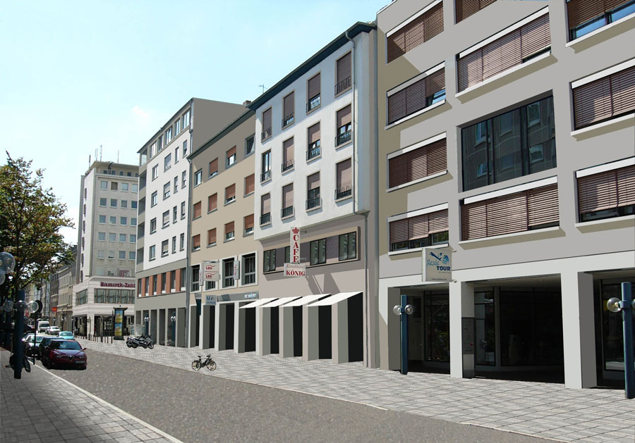 Anhand von positiven Beispielen und überarbeiteten Bestandsbildern werden die Ziele der Fassadenaufwertung dargestellt und textlich erläutert. Die überwiegend aus der Wiederaufbauzeit stammende, teilweise sehr qualitätvolle Bestandsbebauung dient als Ausgangspunkt für die Erarbeitung eines unverwechselbaren gestalterischen Profils. Alleinstellungsmerkmale werden nicht durch eine Kopie austauschbarer Trends, sondern auf der Grundlage der Besonderheit des Vorhandenen entwickelt.