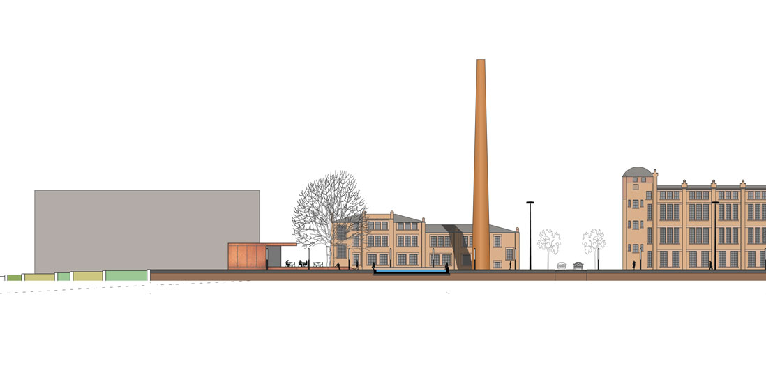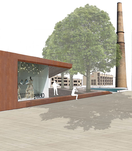 Vor den Gebäuden wird ein offener, vielfältig nutzbarer Platzbereich ausgebildet. Unmittelbar an den offenen Platz vor den Bestandsgebäuden angrenzend wird ein Gebäude für eine gastronomische Nutzung vorgeschlagen. Der noch bestehende Schornstein wird erhalten. Er bildet durch seine Höhe eine weithin sichtbare Landmarke und verortet den neuen Platz in der Stadt. Gemeinsam mit den beiden Bestandsgebäuden bildet er ein Ensemble, das die Geschichte des Ortes erlebbar macht und zusammen mit der Platzgestaltung einen unverwechselbaren und identitätsstiftenden Gebietsmittelpunkt definiert. Zwischen Schornstein und Gastronomiegebäude ist ein flaches Wasserbecken vorgesehen. Zwischen dem offenen Platz vor den Bestandsgebäuden und der südlich an den Platz angrenzenden Landschaft wird ein langer Hain aus Kiefern und vereinzelten Eichen als vermittelndes Element zwischen steinernem Platz und offener Landschaft angelegt.