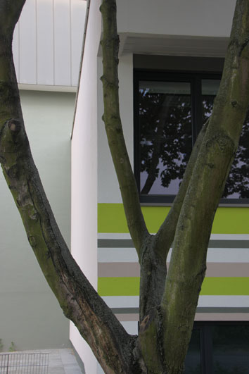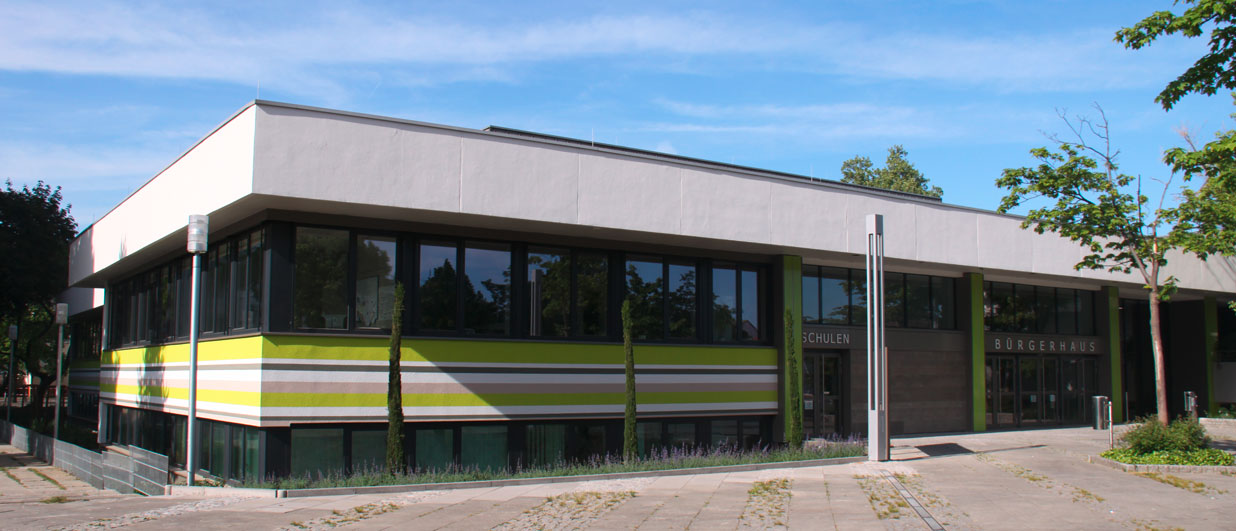 Die Stadt Viernheim beauftragte eine Beratung zur Fassadengestaltung des Bürgerhauses, begleitend zum Planungs- und Bauprozess der energetischen Sanierung. Die Beratung umfasste den gestalterischen Fassadenentwurf, die Farb- und Materialwahl, Beratung während der Ausführungsplanung sowie Vorschläge zur Detailausbildung. Die schwer wirkende Betonfassade aus den 1970er Jahren wurde durch differenzierte Farbgebung gegliedert. Der Eingangsbereich wurde durch eine Natursteinverkleidung aufgewertet. Die Verwendung von hellem Grün und die horizontalen Streifen der Brüstung setzen der Schwere der vorhandenen Architektur belebende Elemente entgegen.
