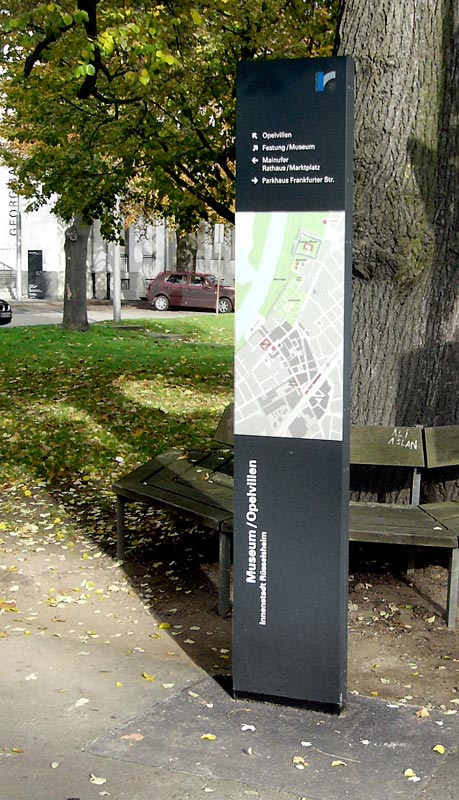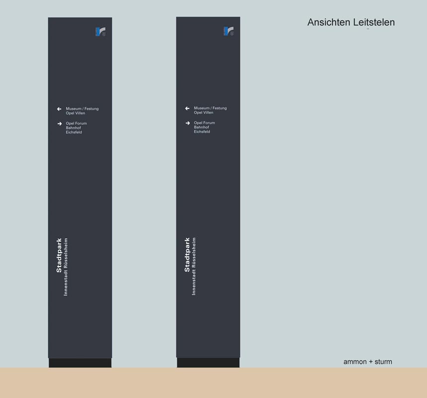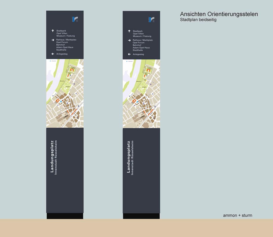 Die Orientierungs- und Leitstelen informieren die Besucher über die Vielfalt und Qualität des Angebotes an attraktiven Orten in und um die Innenstadt Rüsselsheims. Die Tafeln verdeutlichen die Vielzahl der sehenswerten Orte und gewähren eine Orientierung. Eine hochwertige Gestaltung der Stelen und der verwendeten Graphiken unterstützt, gerade in einem in Teilbereichen noch desparaten städtebaulichen Umfeld, die Darstellung vorhandener Qualitäten.