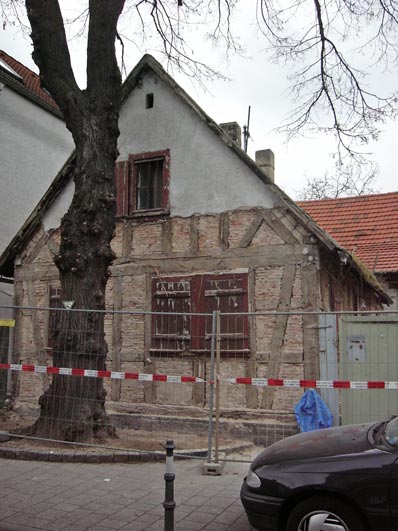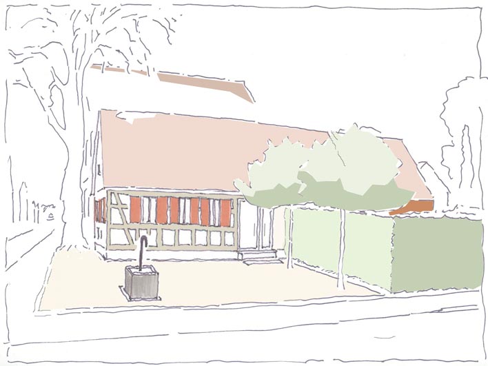Für eines der ältesten Fachwerkhäuser Raunheims wurden verschiedene Nutzungsvarianten untersucht. Das Gebäude zeichnet sich durch seine Lage am Eingang zum historischen Ortszentrum aus. Kennzeichnend ist die enge Verbindung zu der alten Linde an der Giebelseite, die als Naturdenkmal eingetragen ist. Baum und Haus bilden ein seit langem verbundenes, fast archaisch wirkendes Paar. Um dieses Bild zu erhalten wurde der weitgehende Erhalt des historischen Gebäudevolumens, auch im Dachbereich, vorgeschlagen. Ein kleiner Anbau führt die Kubatur mit zeitgerechten Materialen fort. Dem Haus wird ein kleiner Platz vorgelagert.
