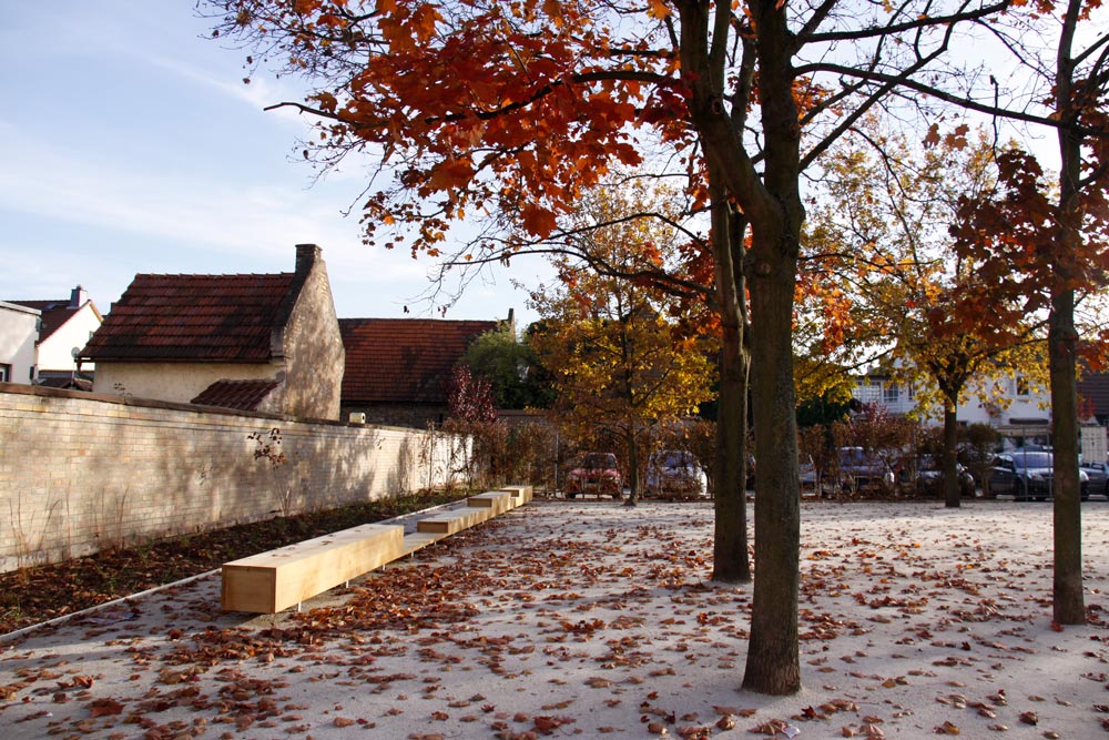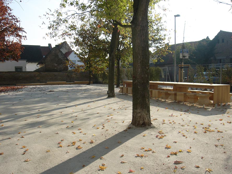 Einige verkümmerte Sträucher, zwei Bänke, Papierkörbe, etwas Rasen, angrenzend ein Parkplatz: so stellte sich der kleine Platz an der Waldstraße vor dem Umbau dar. Die neue Gestaltung soll die Bewohner verstärkt zum Aufenthalt einladen. Eine lange Bank und ein Tisch unter Bäumen laden zum Sitzen ein. Die vorhandenen Bäume werden ergänzt. Zu den anliegenden Straßen erhielt der Platz eine an Waldränder erinnernde Bepflanzung. Zum benachbarten Parkplatz wird die Fläche durch eine im Frühjahr blühende Weißdornhecke abgetrennt. Spielgerät wurde durch eine spezialisierte Werkstatt mit Kindern aus benachbarten Kindergärten geplant.