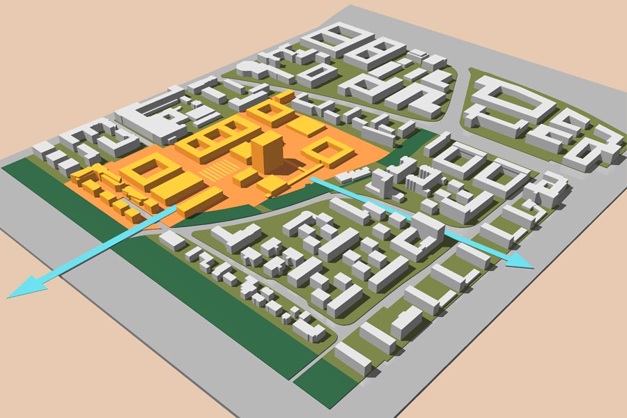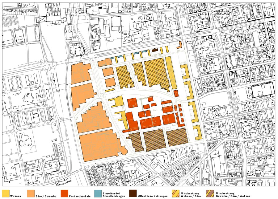 In einem gemeinsam von Stadt und Fachhochschule Darmstadt beauftragten Rahmenplanverfahren sollte die weitere bauliche Entwicklung des Planungsgebietes unter besonderer baulicher Berücksichtigung der Perspektiven für die Fachhochschule geklärt werden. Für das sogenannte ›graphische Viertel‹, das für die wirtschaftliche und städtebauliche Entwicklung der Stadt Darmstadt in den Nachkriegsjahren des vergangenen Jahrhunderts von besonderer Bedeutung war, wurden zunächst grundsätzliche Entwicklungsszenarien erarbeitet. Diese waren Grundlage einer zweitägigen Planungswerkstatt mit Stadtverwaltung, Fachhochschule, Fachplanern, Politik und Grundstückseigentümern. Aufbauend auf den Ergebnissen der Planungswerkstatt wurde ein übergeordnetes Leitbild für die weitere Entwicklung des Gebietes erarbeitet. Das Leitbild, die Ziele für die Vertiefungsbereiche und ein Konzept zur weiteren Prozessteuerung sind die Bausteine der Rahmenplanung.