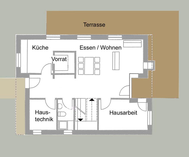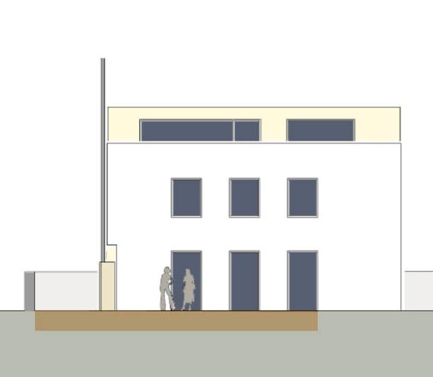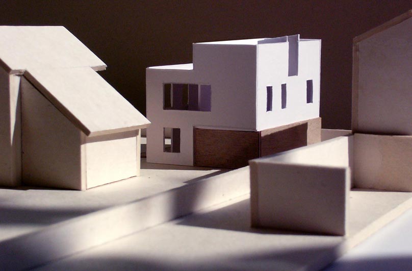 Wohnhaus für ein junges Paar. Das Gebäude entsteht in heterogener Umgebung auf einem bereits bebauten Grundstück. Durch die Ausrichtung des Hauses zum gemeinsamen Garten und das Angebot kleiner, intimer Freibereiche, die durch Einschnitte in den Baukörper entstehen, wird auf die umgebende Situation reagiert.